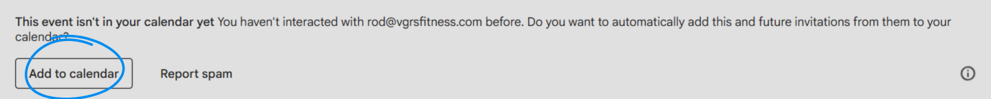 Step 1: IMPORTANT add the event to your calendar you need to go to your email, and open "Invitation from an unknown sender" from a @vgrsfitness.com domain, and click the "Add to Calendar" button